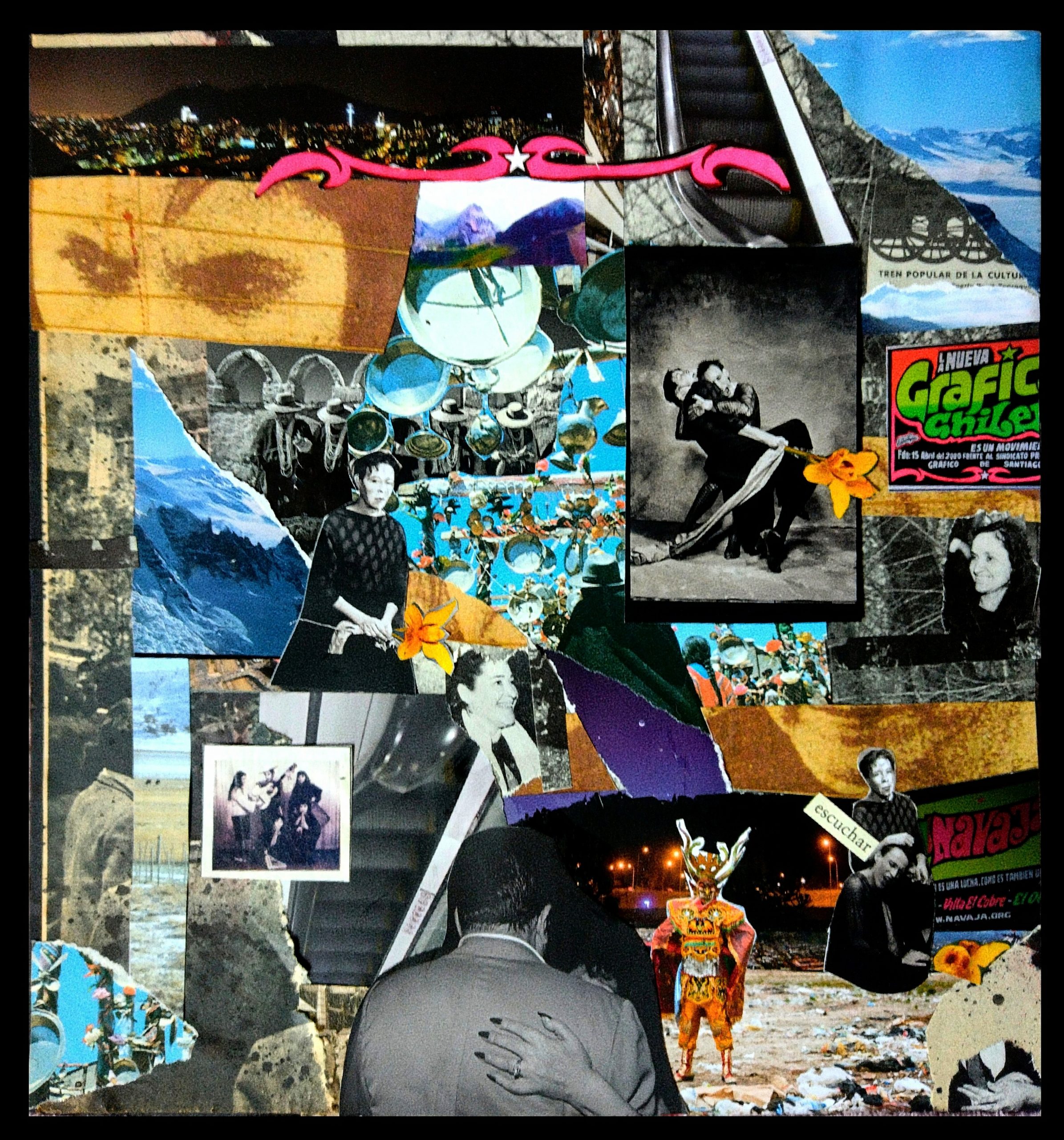 Está obra está realizada con la técnica del collage análogo,quise representar la diversidad cultural que habita en la historia de Chile, a través de la investigación de las imágenes, los colores, las texturas que se utilizaron para formar una conjunto simbólico y armonioso.