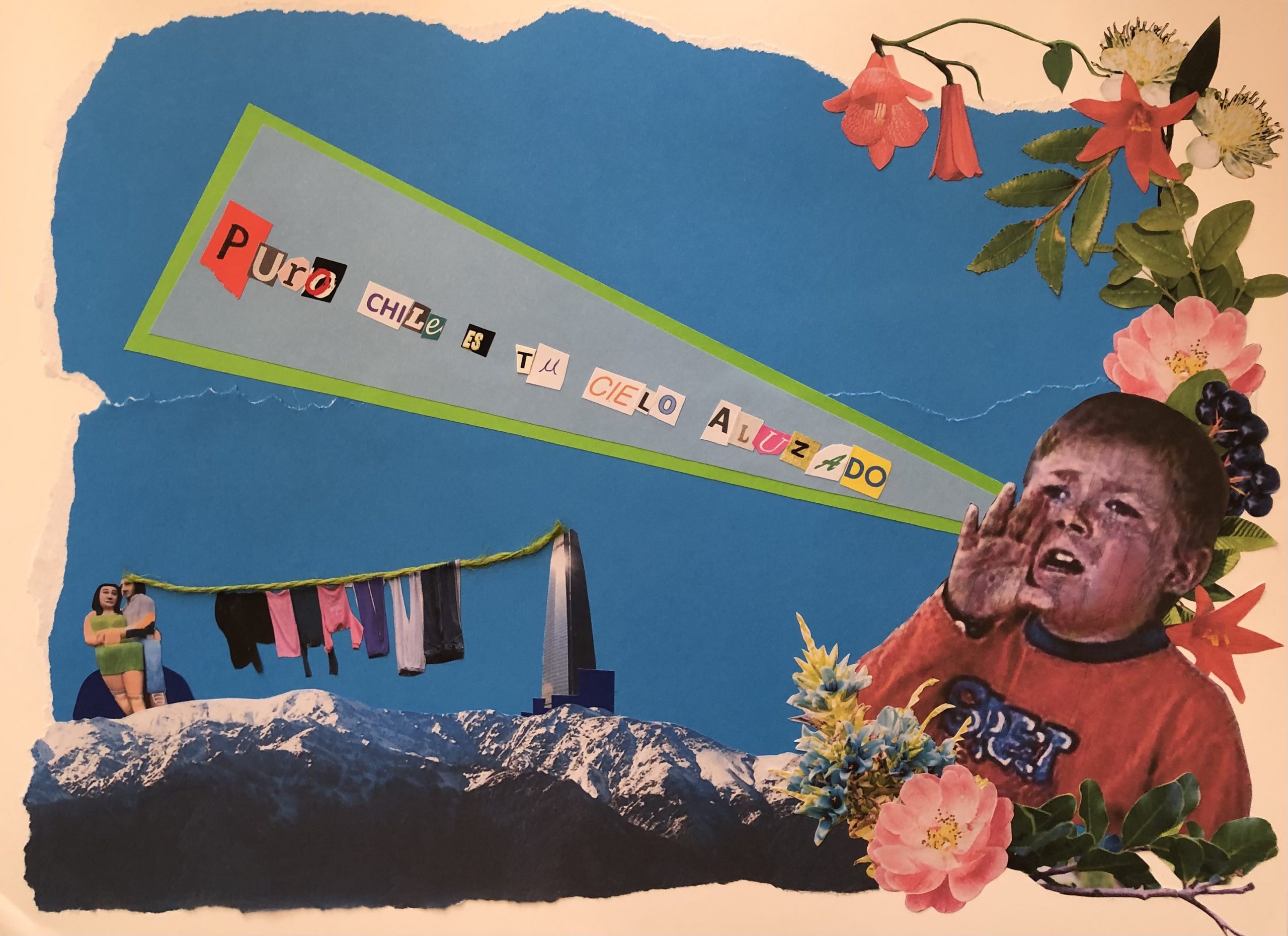 Mi collage busca reflejar el humor y la ironía siempre presentes en nuestra cultura chilena, centrándose en nuestro himno, el lenguaje peculiar, personajes y monumentos; todo mezclado con la belleza de nuestra cordillera y la flora nativa.