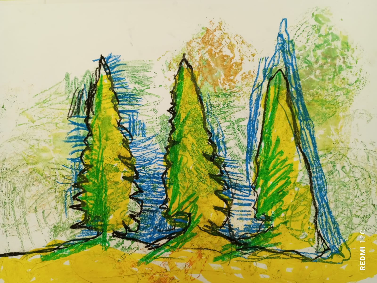 Felipe es un amante de la naturaleza. Aunque no se comunica con palabras, transmite sus emociones con fuerza a través de gestos y el arte. En esta obra representa un ciprés chileno, árbol que refleja tanto la si