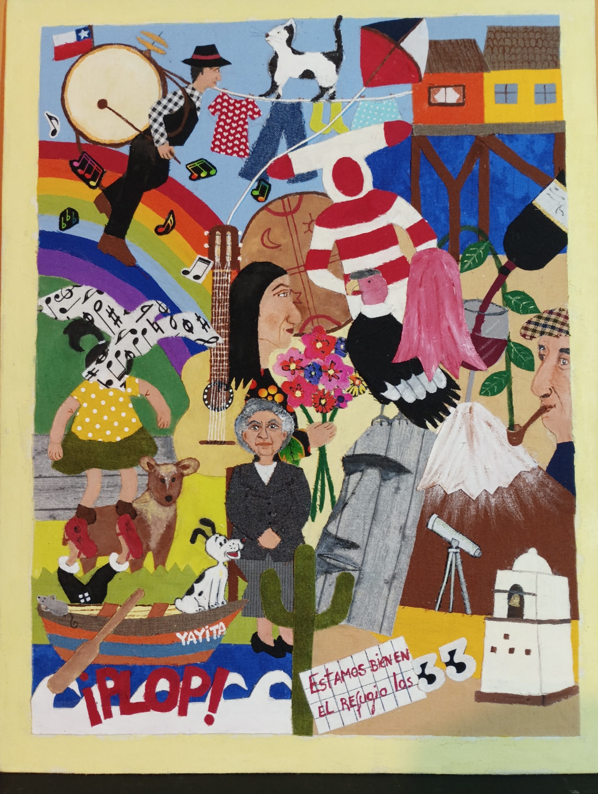 Esta obra fue hecha utilizando retazos de tela, con los cuales me inspiré para recrear algunos paisajes, personajes, hechos, flora y fauna de Chile, con los que el collage cobra vida con el colorido de estos retazos.