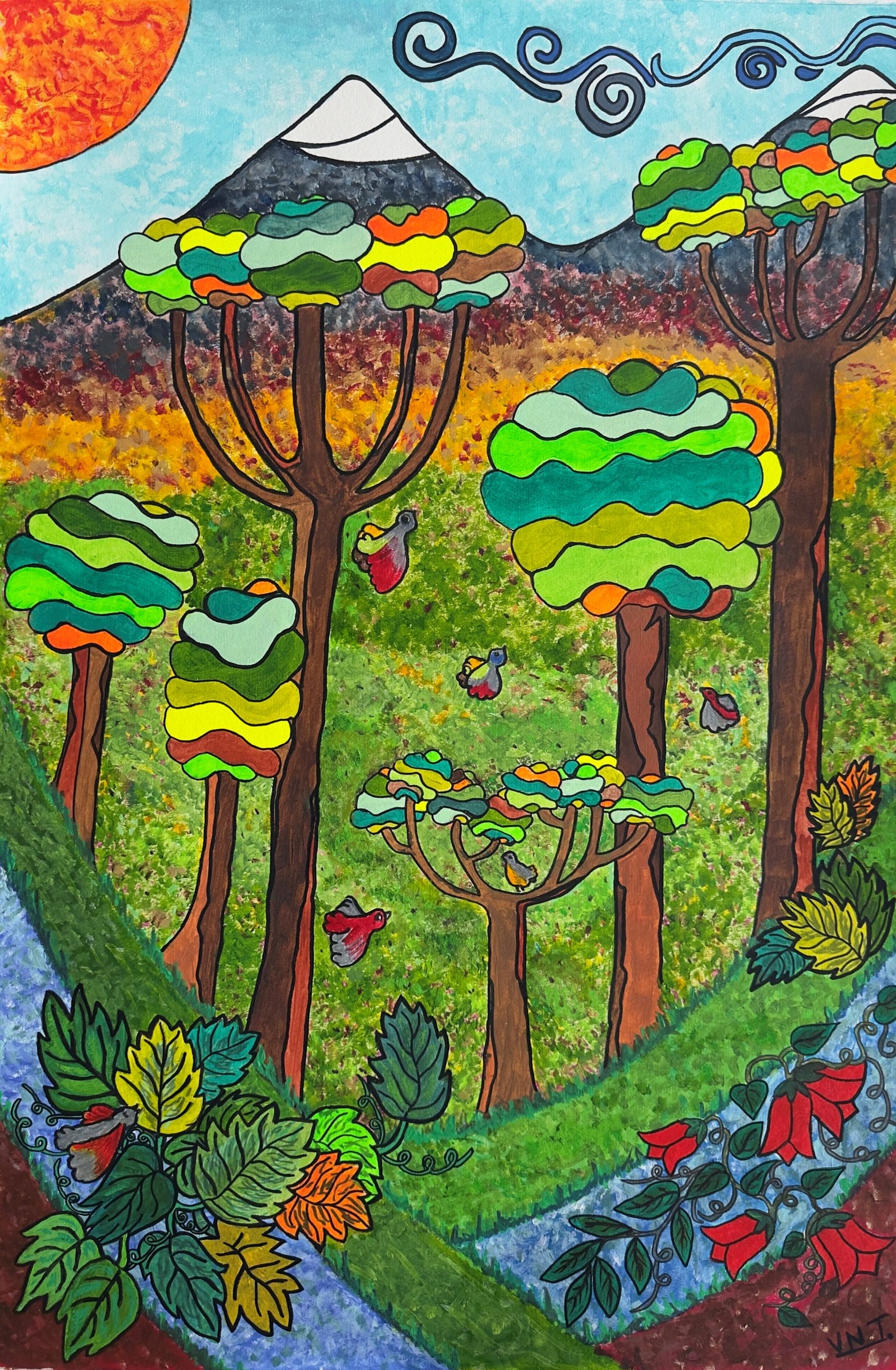 Obra que captura la esencia de un paisaje montañoso y boscoso inspirado en la rica biodiversidad del sur de Chile. Una celebración de la naturaleza, un ecosistema vibrante y lleno de colores invitando al espectador a sumergirse en la exuberancia de un bosque mágico.