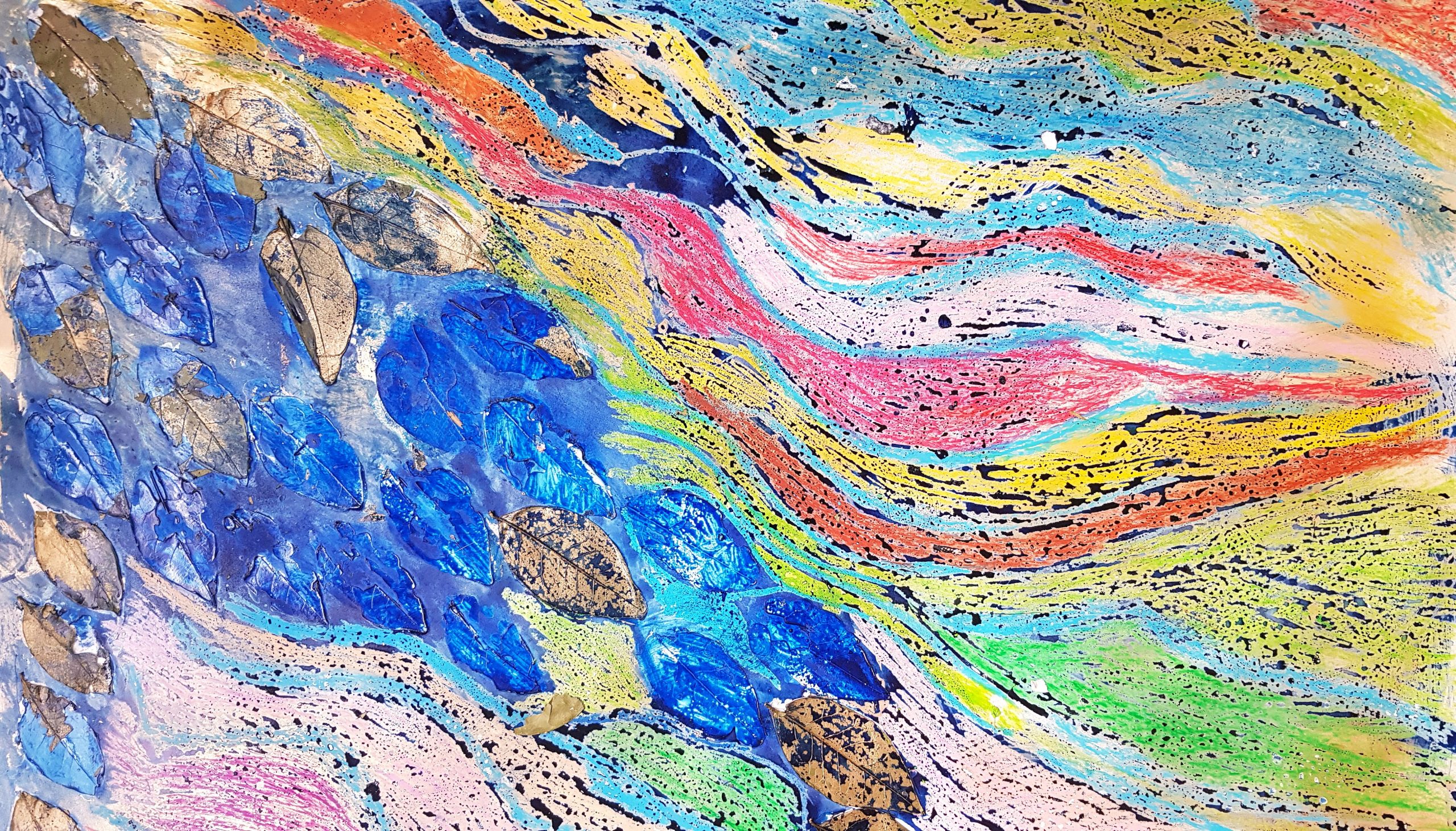 Trabajo de collage sobre papel utilizando hojas de árbol, tinta china y lápiz cera. La idea es representar el viento y sus colores y la sensación de sentir el viento en el bosque.