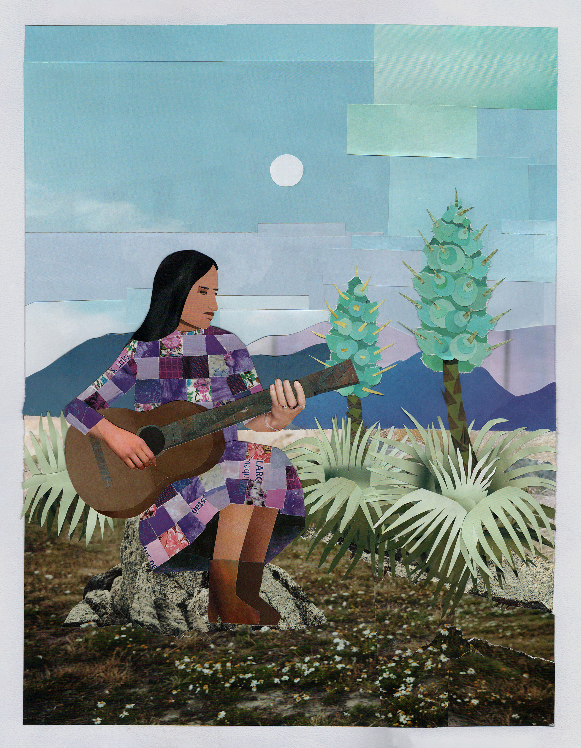 Collage análogo. Ocupé revistas de circulación nacional, que en vez de mostrar nuestra belleza se centran en aspiraciones extranjeras. De estas imágenes no recorté figuras, sino pedacitos de colores y texturas. Pegando formé a la imagen de Violeta entre chaguales a la falda de la cordillera.