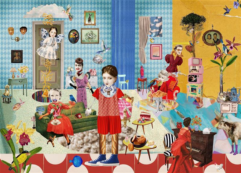 Esta obra teje objetos, figuras familiares y escenas oníricas en un retrato de lo cotidiano chileno. Entre colores y texturas maximalistas, rescata memoria y pertenencia. “Fragmentos dispersos” que, al unirse, revelan una identidad viva que se reinventa en cada generación.