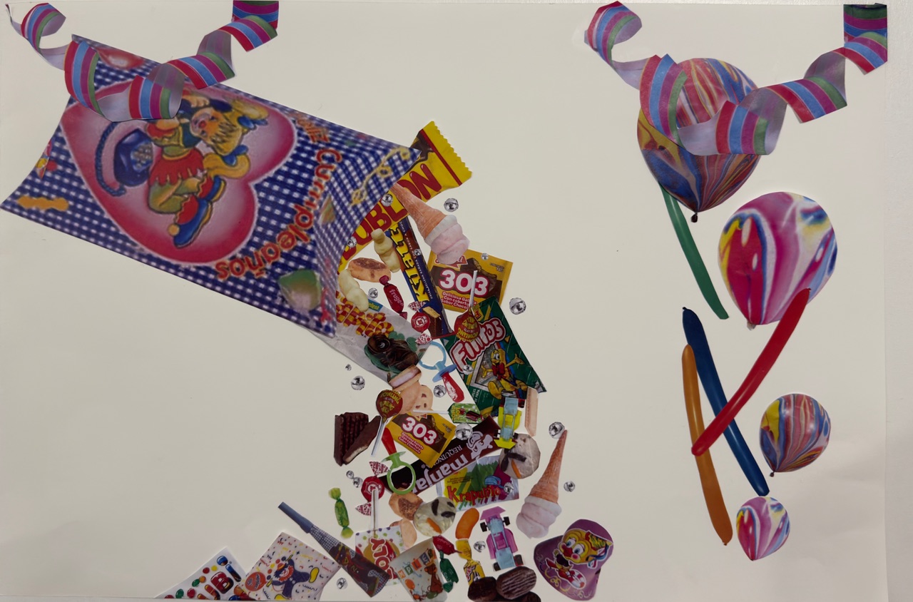 Collage que retrata un cumpleaños típico chileno, donde los dulces y las risas se transforman en símbolos de unión y recuerdos. A través de los retazos, la obra busca evocar la calidez de esas celebraciones familiares que dejan huella en la memoria infantil, con aroma a chocolate e ingenuidad.