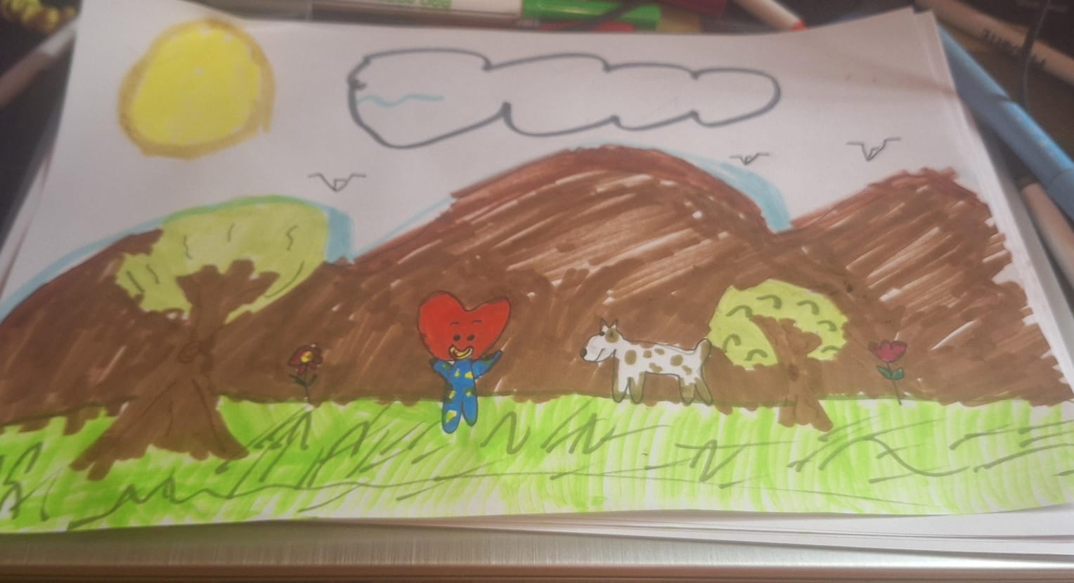 Se trata de tata de bt21 que está en un mundo rural con perros quiltro, árboles, montañas, nubes y flores