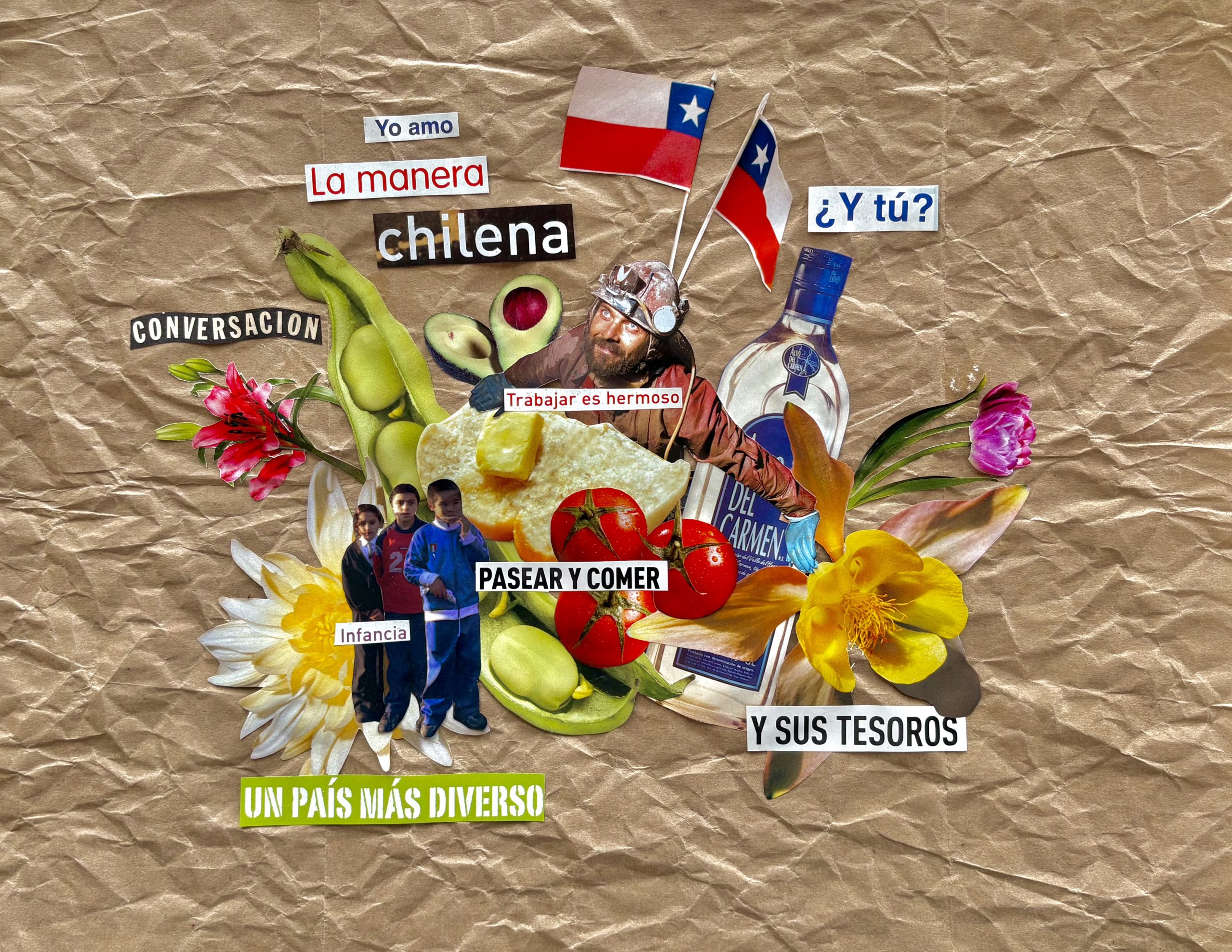 En este collage se puede observar un retrato de la vida cotidiana chilena. Algunos productos típicos del día a día de Chile, como la marraqueta, el tomate, la palta, habas y pisco. También personajes típicos del país como el minero y los niños. Realizado con recortes de revistas chilenas vintage.